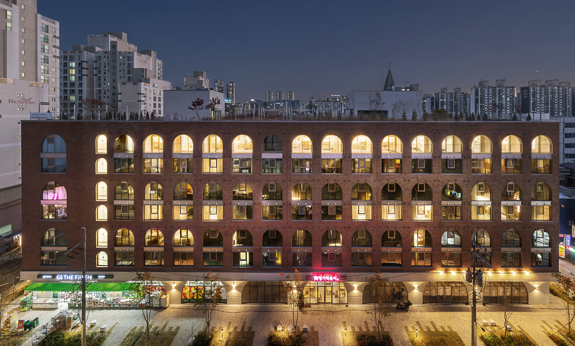 Yeongdeungpo-gu retains the form of the 'oldest town' in Seoul, which is transforming from a steel-industrial cluster in the past to a cultural-arts hub based on regional policies. The project is a shared residential space to be operated by KT Estate, aiming for a concept differentiated from the previous Remarkville, and proceeding with art & tech as an element that maximizes user experience. These two keywords have been treated as important in human society, and related knowledge is a concept that is a topic of continuous interest in modern society. Bricks, arches, and concrete are applied as the basic concept of space that guarantees temporality, and they hold the overall tone and manner of the interior and exterior. A common workspace where you can directly experience and create artwork, application of wellness programs, and shared facilities related to lifestyle are provided as a program for forming a small society for the current generation and a place that maximizes user experience.