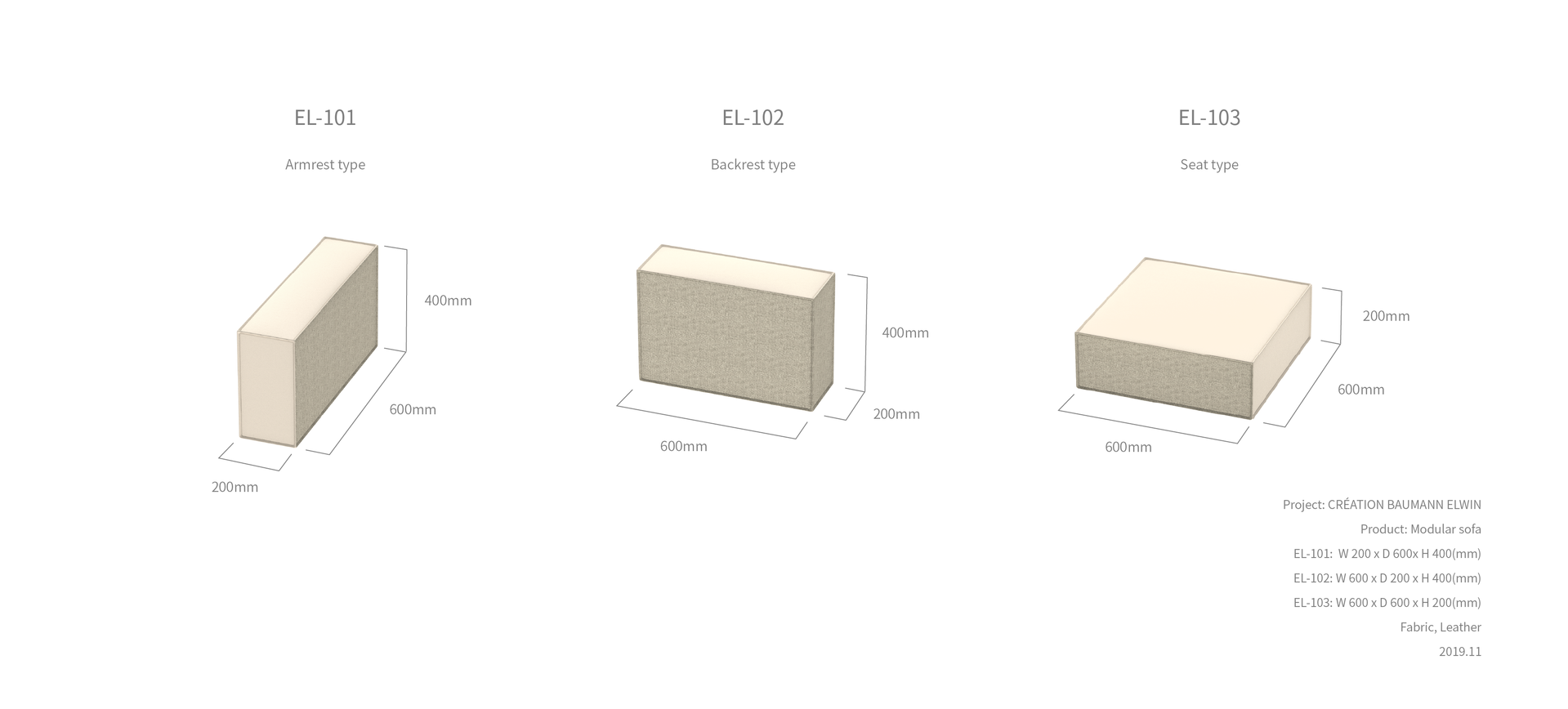 | CREATION BAUMANN ELWIN | modular sofa | EL-101 : W200 * D600 * H400 EL-102 : W600 * D200 * H400 EL-103 : W600 * D600 * H200 (mm) | fabric leather |